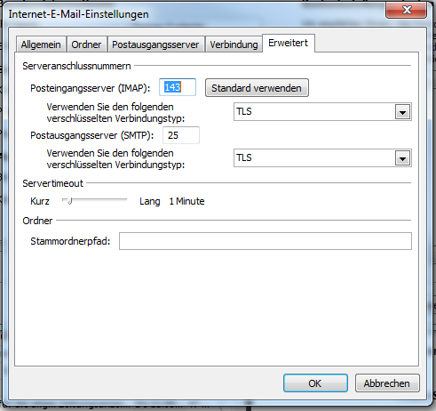 Achtung: TLS verschlüsselt ausschließlich den Übertragungsweg, nicht die Inhalte der E-Mails (dazu benötigen Sie z. B. eine PGP Verschlüsselung, die lokal durch Ihren EDV-Dienstleister einzurichten ist).