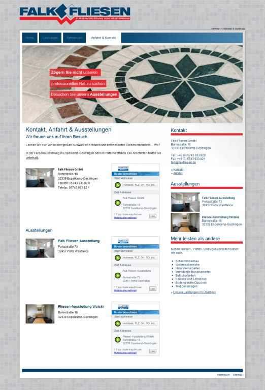 Für unseren Kunden Falk Fliesen aus Espelkamp erstellten wir eine Web-Visitenkarte auf Basis des vorhandenen Corporate Designs. Das Augenmerk wurde auf die professionellen Arbeiten des Unternehmens gelegt. Diese sprechen, dank des großflächigen Einsatzes von Referenz-Fotos, für sich und repräsentieren damit die Arbeiten des Kunden!
